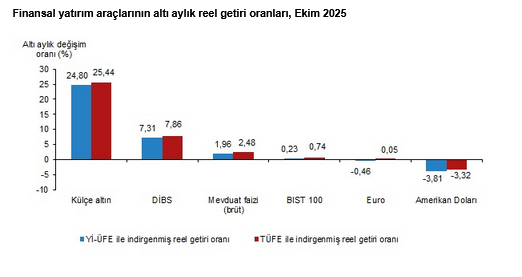 Altı aylık değerlendirmeye göre külçe altın; Yİ-ÜFE ile indirgendiğinde yüzde 24,80, TÜFE ile indirgendiğinde ise yüzde 25,44 oranlarında yatırımcısına en yüksek reel getiri sağlayan yatırım aracı olurken; aynı dönemde Amerikan Doları endeksi, Yİ-ÜFE ile indirgendiğinde yüzde 3,81, TÜFE ile indirgendiğinde ise yüzde 3,32 oranlarında yatırımcısına en çok kaybettiren yatırım aracı oldu.