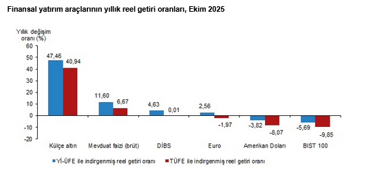 Finansal yatırım araçları yıllık olarak değerlendirildiğinde külçe altın; Yİ-ÜFE ile indirgendiğinde yüzde 47,46, TÜFE ile indirgendiğinde ise yüzde 40,94 oranlarında yatırımcısına en yüksek reel getiri sağlayan yatırım aracı oldu.