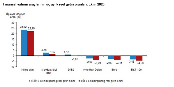 Külçe altın, üç aylık değerlendirmede; Yİ-ÜFE ile indirgendiğinde yüzde 23,62, TÜFE ile indirgendiğinde ise yüzde 22,19 oranlarında yatırımcısına en yüksek reel getiri sağlayan yatırım aracı oldu. Aynı dönemde BİST 100 endeksi; Yİ-ÜFE ile indirgendiğinde yüzde 3,45, TÜFE ile indirgendiğinde ise yüzde 4,56 oranlarında yatırımcısına en çok kaybettiren yatırım aracı oldu.